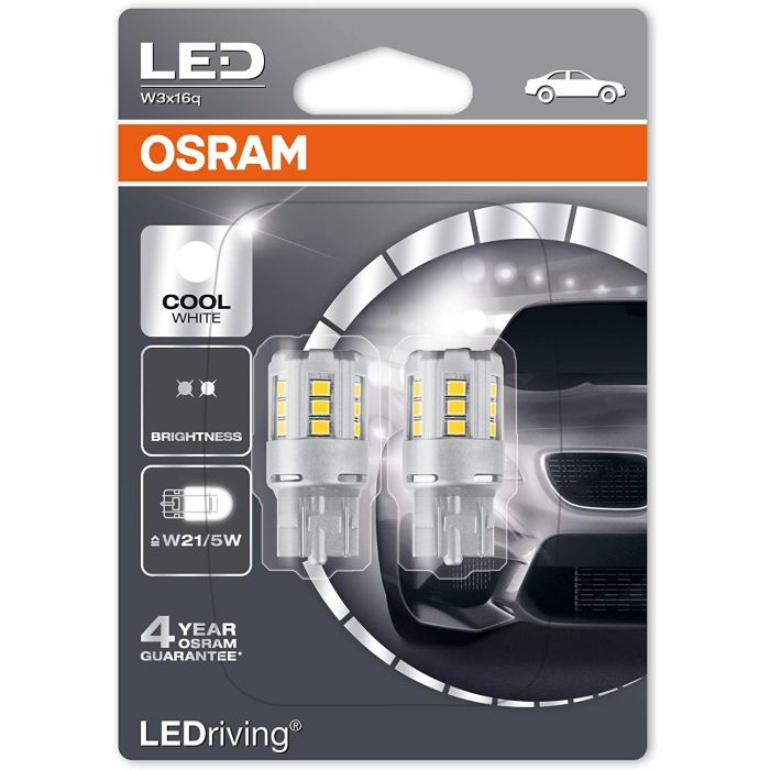 Osram LEDriving W21/5W Cool White LED bulbs fit all cars with double filament 7443 W21/5W bulbs.